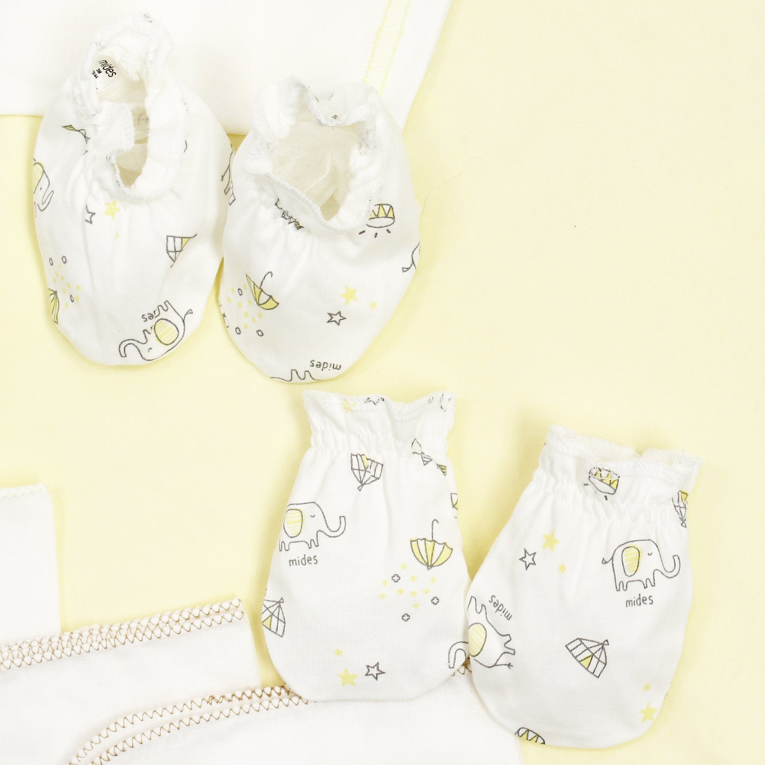 一套9件(綁帶長袍x1件,綁帶短衫x1件,手套x1對,腳套x1對,包被x1件,紗巾x4條)